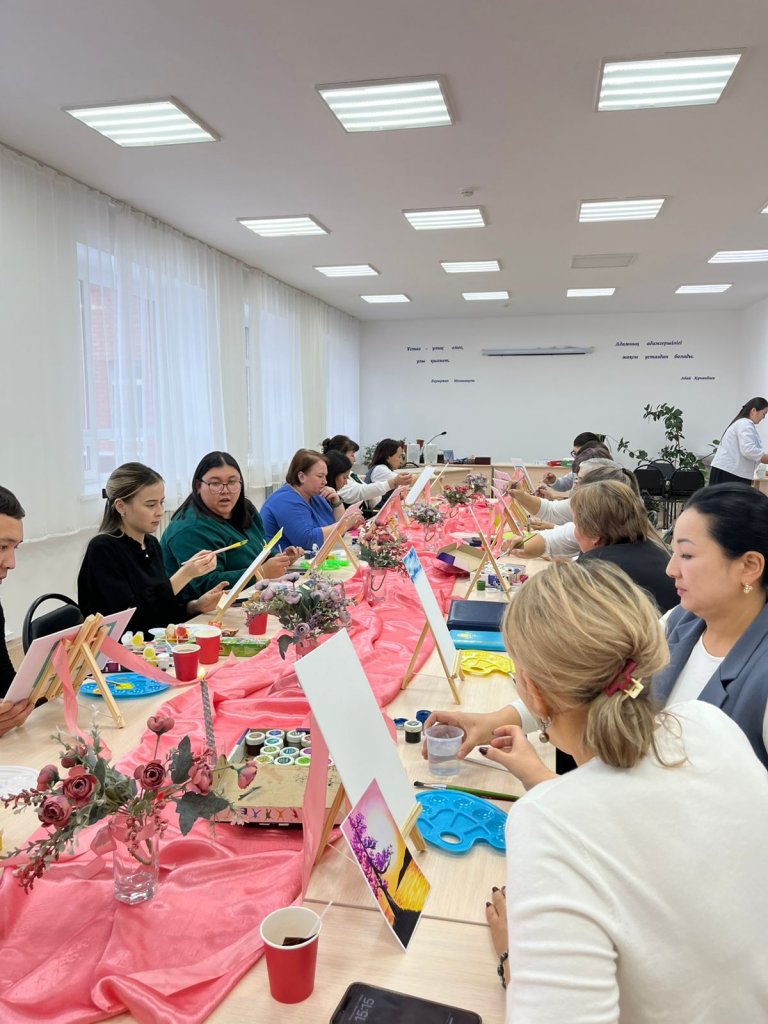 Бүгін, 10 қараша күні, «Эстетикалық пәндер онкүндігі» аясында мектебіміздің көркем еңбек пәнінің мұғалімі Жуманбаева С.Т. ұстаздарға арналған ерекше арт-терапия сабағы – «Ұстаз жүрегінің бояулары» өткізді.