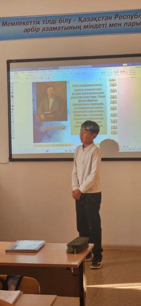 "Қазақ тілі мен әдебиеті" апталығы аясында 09 қазан күні 7 «А» сыныбында «Абай – дана, Абай – дара қазақта» тақырыбында әдеби кеш өтті. Кештің мақсаты – ұлы ақынның өмірі мен шығармашылығын терең таныту, Абайдың адамгершілік пен білімге шақырған өсиеттерін оқушылардың бойына сіңіру болды. Оқушылар ақын өлеңдерін мәнерлеп оқып, оның нақыл сөздерін талдап, шығармашылығына деген қызығушылықтарын көрсетті. Әдеби кеш барысында Абайдың ұлағатты ойлары мен өнегелі өмірі арқылы оқушылар ұлттық рух пен тілге деген құрметтің маңызын сезінді.